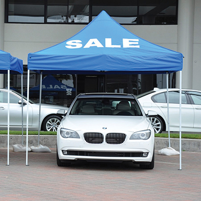 We got your sale covered! Designed to highlight your featured cars. Our 10' x 10' tents are available in Red or Blue with SALE in white on all 4 sides. Commercial grade canvas tops are made of durable water-resistant Dupont Polyester. Tent Frames are made of textured, rust resistant powder-coated steel. All tents include cover bag, ground stakes and weight bags.