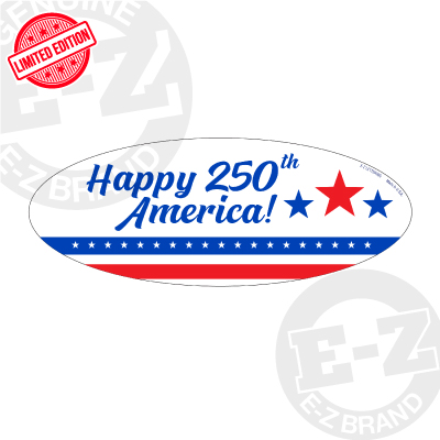 Limited Edition! Celebrate America's 250th with the America 250 oval decals! (20 per pack) Size: 4 1/4" high x 11 1/4" long. Neatly shrink wrapped with a chipboard backer to prevent curling during storage. Made of durable, waterproof vinyl. Each sign is slit on the back for easy application. Removable adhesive allows easy, clean removal.