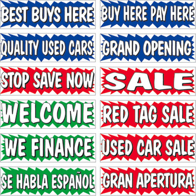 3x10ft vinyl burst banners! Made of heavy-duty, reinforced, weatherized vinyl with grommets. 5 ft. rope ties included. Printed on one side only.