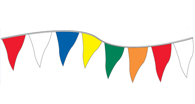 High quality pennants! Made of durable plastic coated cloth, 30 pennants are sewn on a 50 ft.nylon rope. Each pennant is 9 inches wide x 12 inches tall. 16 color combinations are available. Multicolor and Red/White/Blue are usually in stock. Other colors available in approximately eight working days.