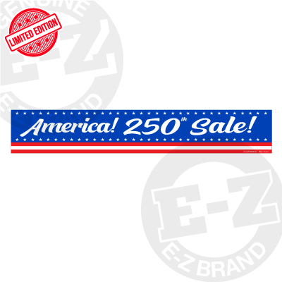 Limited Edition! Celebrate America's 250th with america 250th sale decals! Messaging that demands attention. Made of durable, waterproof vinyl .Each decal is slit on the back for easy application. Removable adhesive allows easy, clean removal. Size: 28" X 4". Sold in packs of 12.