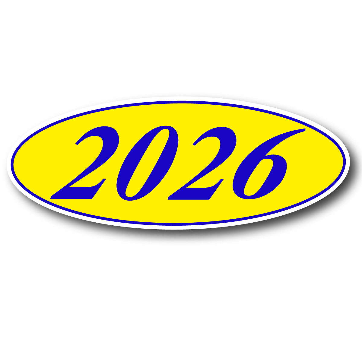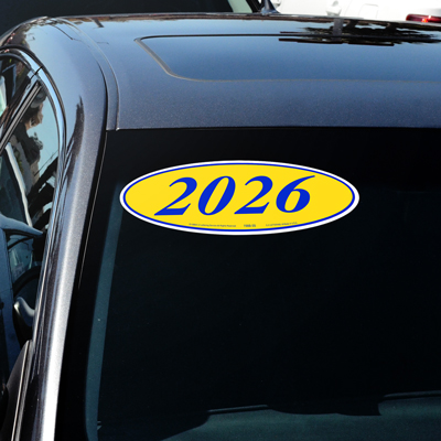 Blue & Yellow oval, adhesive windshield year model sign. An inexpensive yet highly effective sales tool to advertise a year model! Sold by the dozen {12 per pack}. Size: 14" long x 5 1/2" tall. Neatly shrink wrapped in packs of a dozen with a chipboard backer to prevent curling during storage. Made of durable, waterproof vinyl, these bright, non-fade signs demand attention! Each sign is slit on the back for easy application. Removable adhesive allows easy, clean removal. Add features and promotions to the oval using our E-Z Arch Slogans (EZ 199-B, EZ 219-B) or E-Z Arrow Slogans (EZ 195-B).