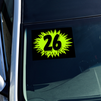 The Burst Year Model Signs with eye-catching fluorescent chartreuse disign are 9" tall x 11" wide. Slit on the back for easy application. Our Easy On, Easy Off decals leave no gummy residue. Made of Durable Waterproof Viny. Sold by the dozen.