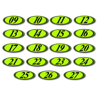 Fluorescent Chartreuse & Black Two Digit oval, adhesive windshield year model sign. An inexpensive yet highly effective sales tool to advertise a year model! Sold by the dozen {12 per pack}. Size: 4 1/4" high x 11 1/4" long. Neatly shrink wrapped in packs of a 12 with a chipboard backer to prevent curling during storage. Made of durable, waterproof vinyl, these bright, non-fade signs demand attention! Each sign is slit on the back for easy application. Removable adhesive allows easy, clean removal. Please note these adhesive signs are not reusable.