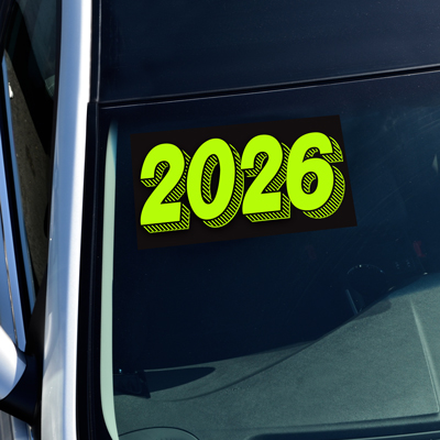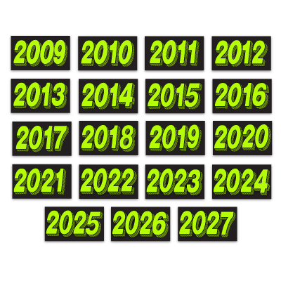 Four digit fluorescent year model signs are 5 3/4" high x 9 1/2" long and made of durable waterproof vinyl. Shrink wrapped and sold by the dozen. Slit on the back for easy use. E-Z on and E-Z off, leaves no gummy residue.