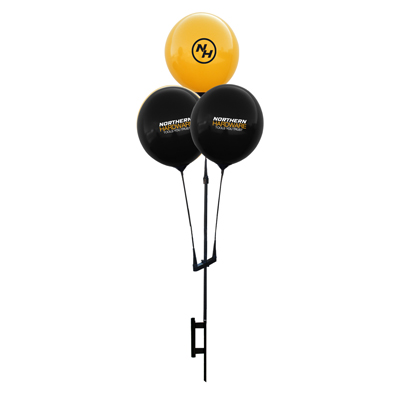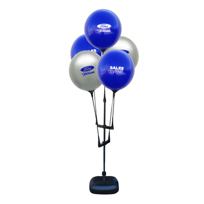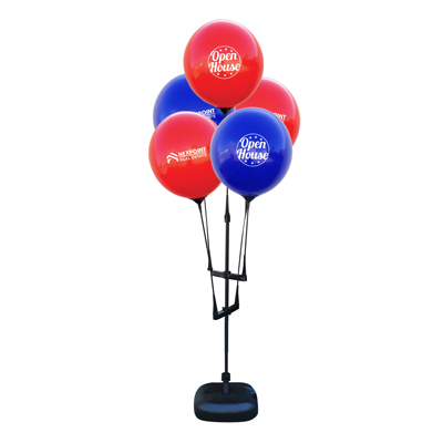 The use of two cluster arms allows this kit to hold five custom reusable balloons at once! Great for dealerships, real estate open house/viewings, grand openings, parties, sales events and any outdoor event!