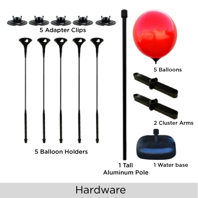 Kit Includes: Five custom reusable balloons, five adapter clips, five balloon holders, one 30'' aluminum pole, two balloon cluster arm and one water base. (Add water or sand to water base)
