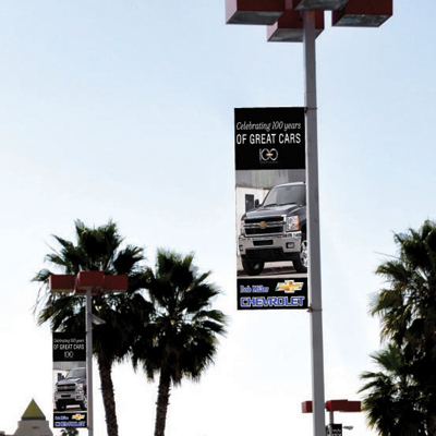 Our Custom Single Pole Banners are printed on both sides giving your lot a cohesive look. Attract attention day and night! These 3' x 8' or 3.5' x 7.5' are digitally printed in full color on both sides. Made of heavy duty 18 ounce tear and weather proof vinyl. Kit comes with one Custom Banner (double sided), two Pole Brackets and 4 nylon straps.