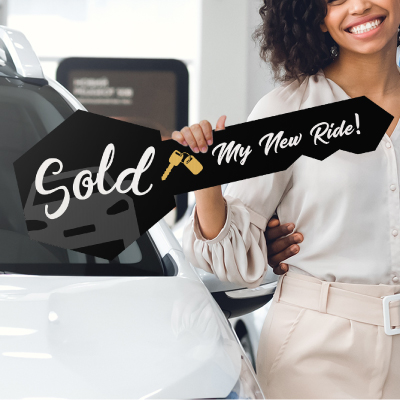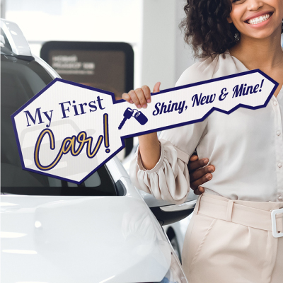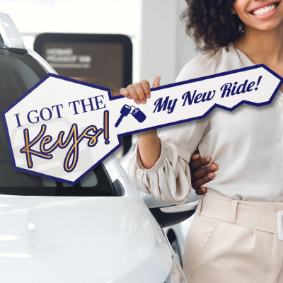 Hand over the key and snap the memories! Gift this sign to your customers to make any car buying or house buying a memorable moment. Size: 24in x 10in. Perfect for any car dealership or real estate closing deal. High quality full color digital printing. Printed on durable coroplast material.