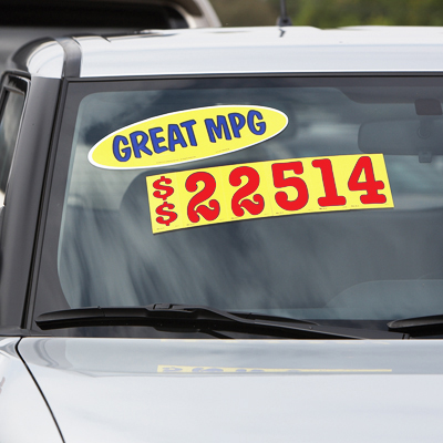 New designer look with non-fade inks! Bold Red on Super Bright Yellow background adhesive windshield number. An inexpensive yet highly effective sales tool to advertise a year model or price. Sold by the dozen {12 per pack}. Size: 5 1/2" tall x 3" wide. Neatly shrink wrapped in packs of a dozen with a chipboard backer to prevent curling during storage. Made of durable, waterproof vinyl, these bright, non-fade numbers demand attention! Each number is slit on the back for easy application. Removable adhesive allows easy, clean removal. Quantity Discount Price available on 25 dozen or more. Not sure what to get? Try our Starter Kit. See EZ228
