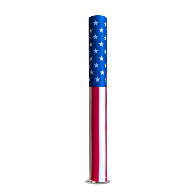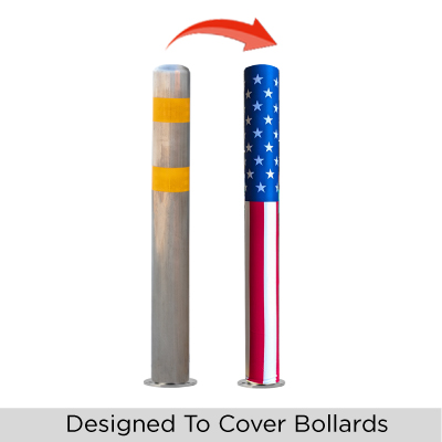 Add a clean patriotic look to your store front with the USA bollard covers! High quality, full color imprint. Size 4.5" diameter x 48" tall. Weather resistant, stretch fit polyester. Custom sizes available. Elastic bottom opening holds in place. For indoor and outdoor use.
