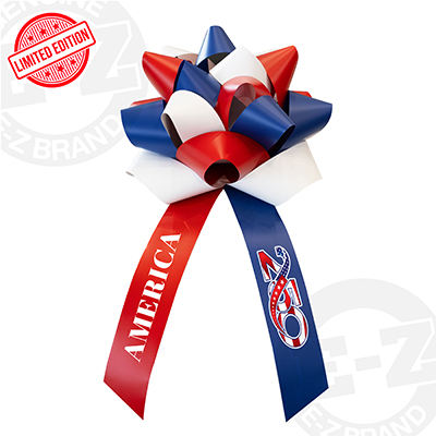 Limited Edition! Celebrate America's 250th with the premium car bows! Add a perfect finishing touch for your showroom patriotic sales. A perfect accent for any vehicle. Made of high quality, weather resistant vinyl. Size: Large 25" Wide x 40'' long. Made for indoor and Outdoor use. Non-scratch, soft magnetic base. No assembly required. Free EZ adhesive tape is available upon request for non-metal surfaces. Add to order notes at checkout.