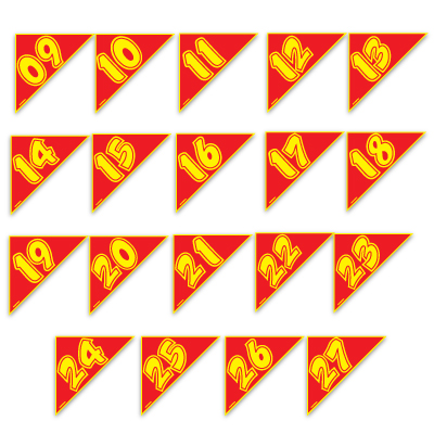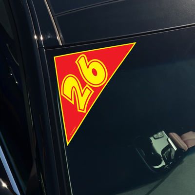 Bright Red and Yellow triangle, adhesive windshield year model decal. Conveniently fits into the corner of a windshield. An inexpensive yet highly effective sales tool to advertise a year model! Sold by the dozen {12 per pack}. Size: 11 inches x 11 inches . Neatly shrink wrapped in packs of a dozen with a chipboard backer to prevent curling during storage. Made of durable, waterproof vinyl, these bright, non-fade signs demand attention! Each sign is slit on the back for easy application. Removable adhesive allows easy, clean removal. Please note these adhesive signs are not reusable.