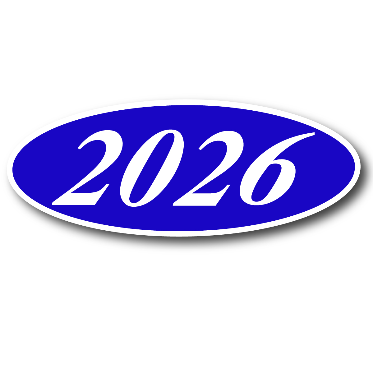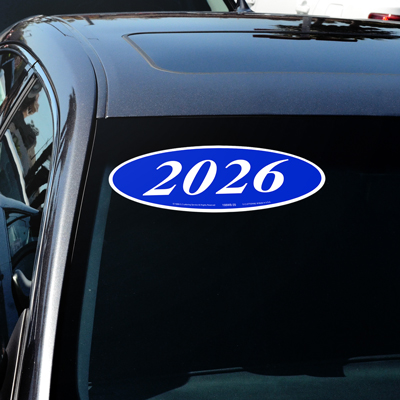 White & Blue oval, adhesive windshield year model sign. An inexpensive yet highly effective sales tool to advertise a year model! Sold by the dozen {12 per pack}. Size: 14" long x 5 1/2" tall. Neatly shrink wrapped in packs of a dozen with a chipboard backer to prevent curling during storage. Made of durable, waterproof vinyl, these bright, non-fade signs demand attention! Each sign is slit on the back for easy application. Removable adhesive allows easy, clean removal.