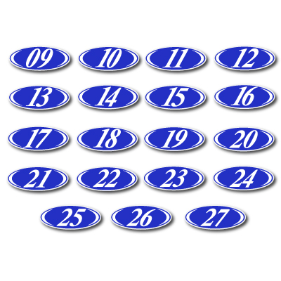 White & Blue Two Digit oval, adhesive windshield year model sign. An inexpensive yet highly effective sales tool to advertise a year model! Sold by the dozen {12 per pack}. Size: 4 1/4" high x 11 1/4" long. Neatly shrink wrapped in packs of a 12 with a chipboard backer to prevent curling during storage. Made of durable, waterproof vinyl, these bright, non-fade signs demand attention! Each sign is slit on the back for easy application. Removable adhesive allows easy, clean removal. Please note these adhesive signs are not reusable.